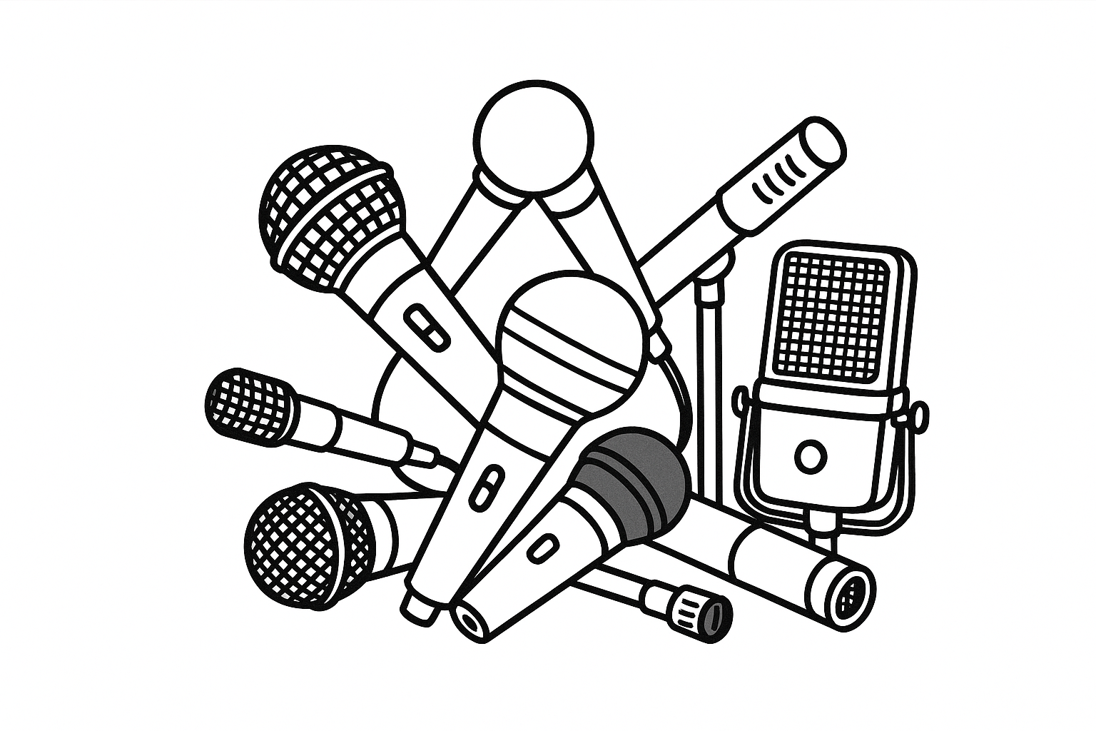 Vorhanden ist eine vielfältige Auswahl an Mikrofonen für Gesang, Instrumente und Schlagzeug. Dazu gehören gängige Modelle wie Shure SM57 und SM58, ergänzt durch verschiedene Mikrofone für Bassdrum, Toms und Overheads.